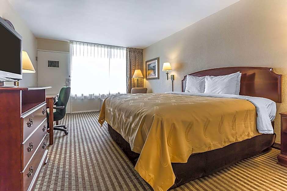 This room features a view of the pool or courtyard, small refrigerator, and microwave. A desk with ergonomic chair is also included.